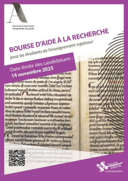 Les Archives départementales de la Haute-Saône sont encore riches de fonds inexploités par la recherche scientifique. Conscient de cet enjeu pour une meilleure connaissance de l’histoire de la Haute-Saône et pour la mise en valeur de ses territoires, le Département souhaite soutenir les recherches menées par des étudiants de master et de doctorat par l’attribution d’une bourse spécifique.